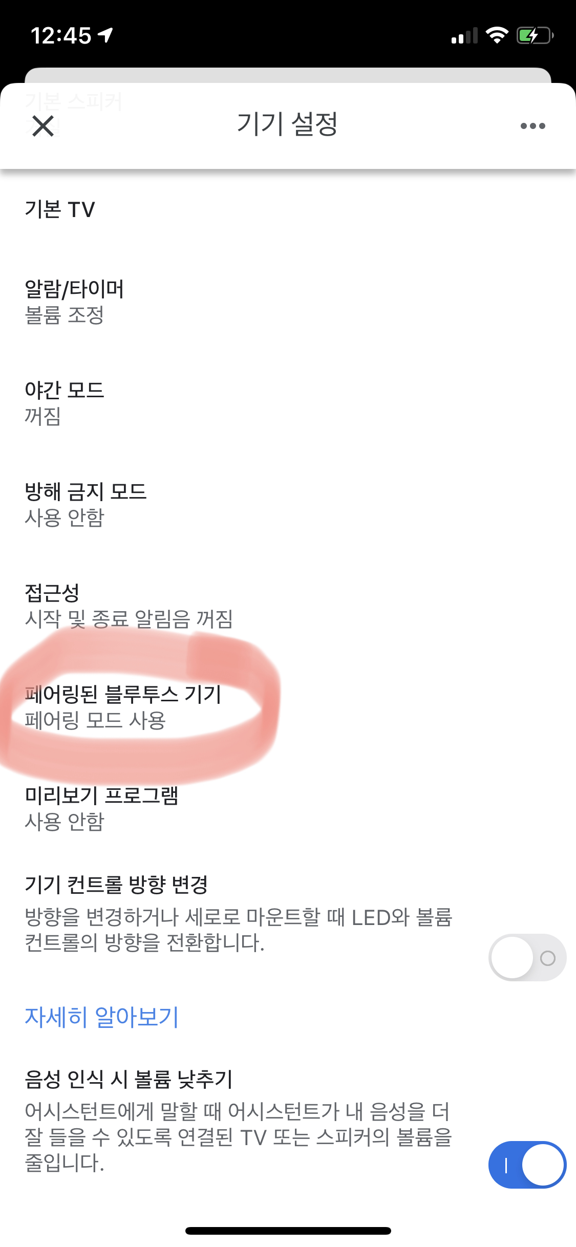 4. 우측 하단의 페어링 모드 사용 클릭하면 구글 홈 미니 상의 페어링 모드가 ON됨!