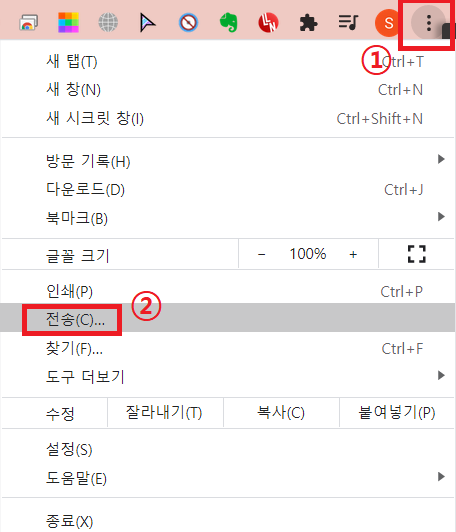 2. 우측 상단의 점 세개 메뉴(설정메뉴) 클릭 후 전송 메뉴 클릭