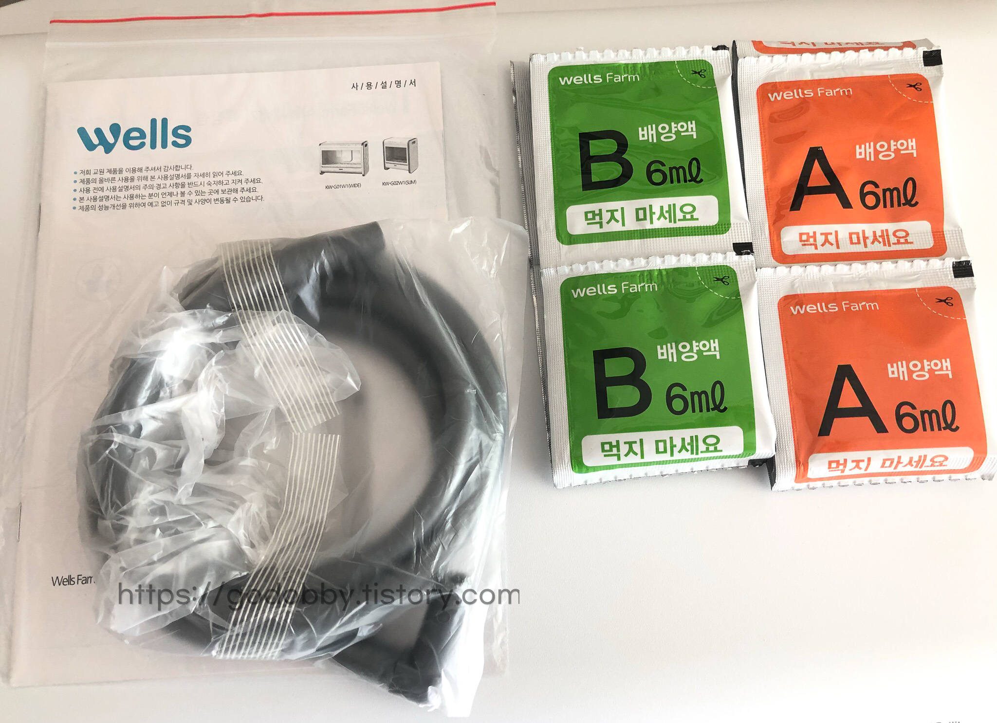 설명서와 배수호스, 배양액 A,B를 주고 가심